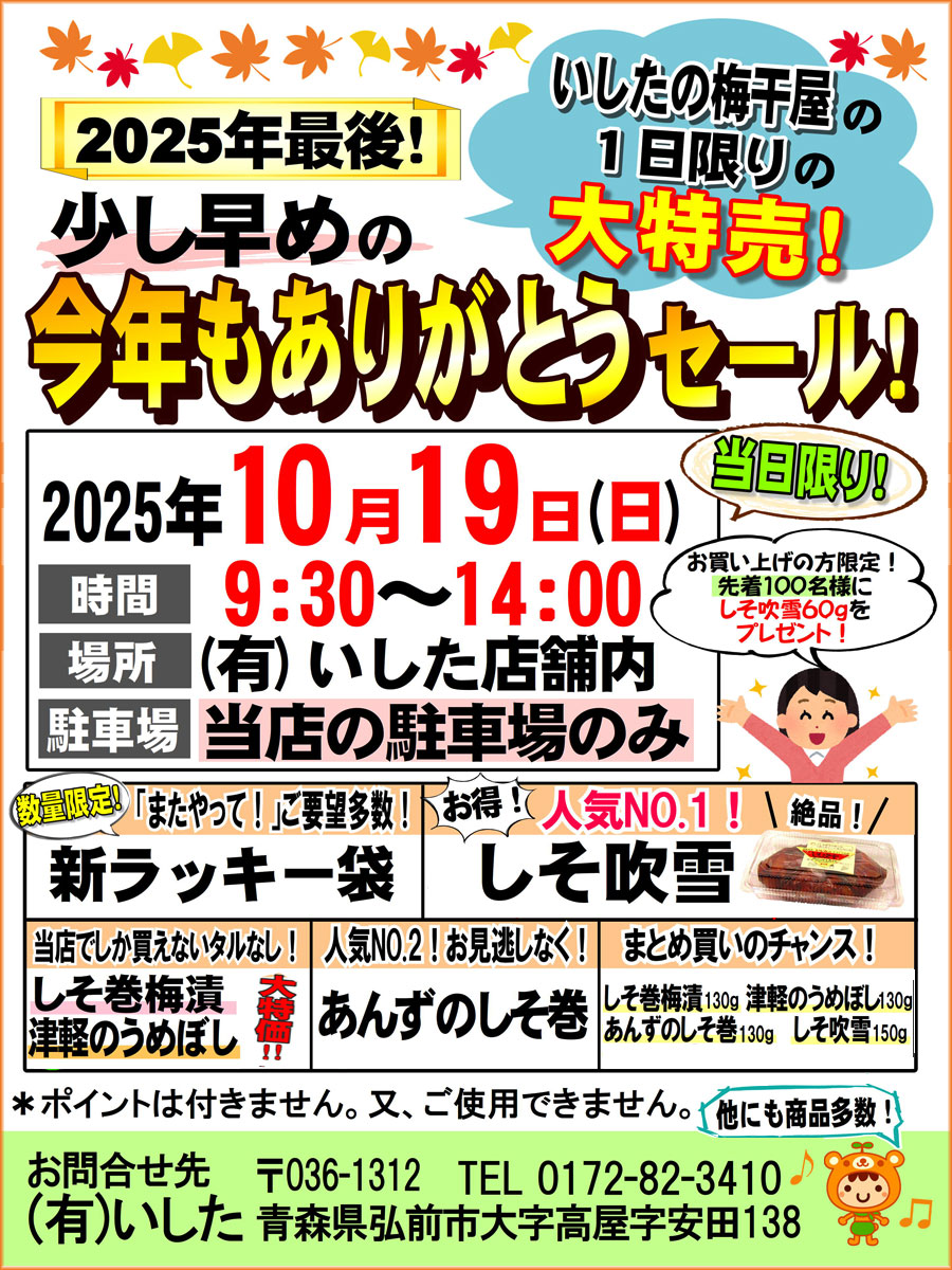 日頃のご愛顧に感謝を込めて、10月19日(日)に「いしたの梅干屋一日限りの大特売会」を開催いたします。